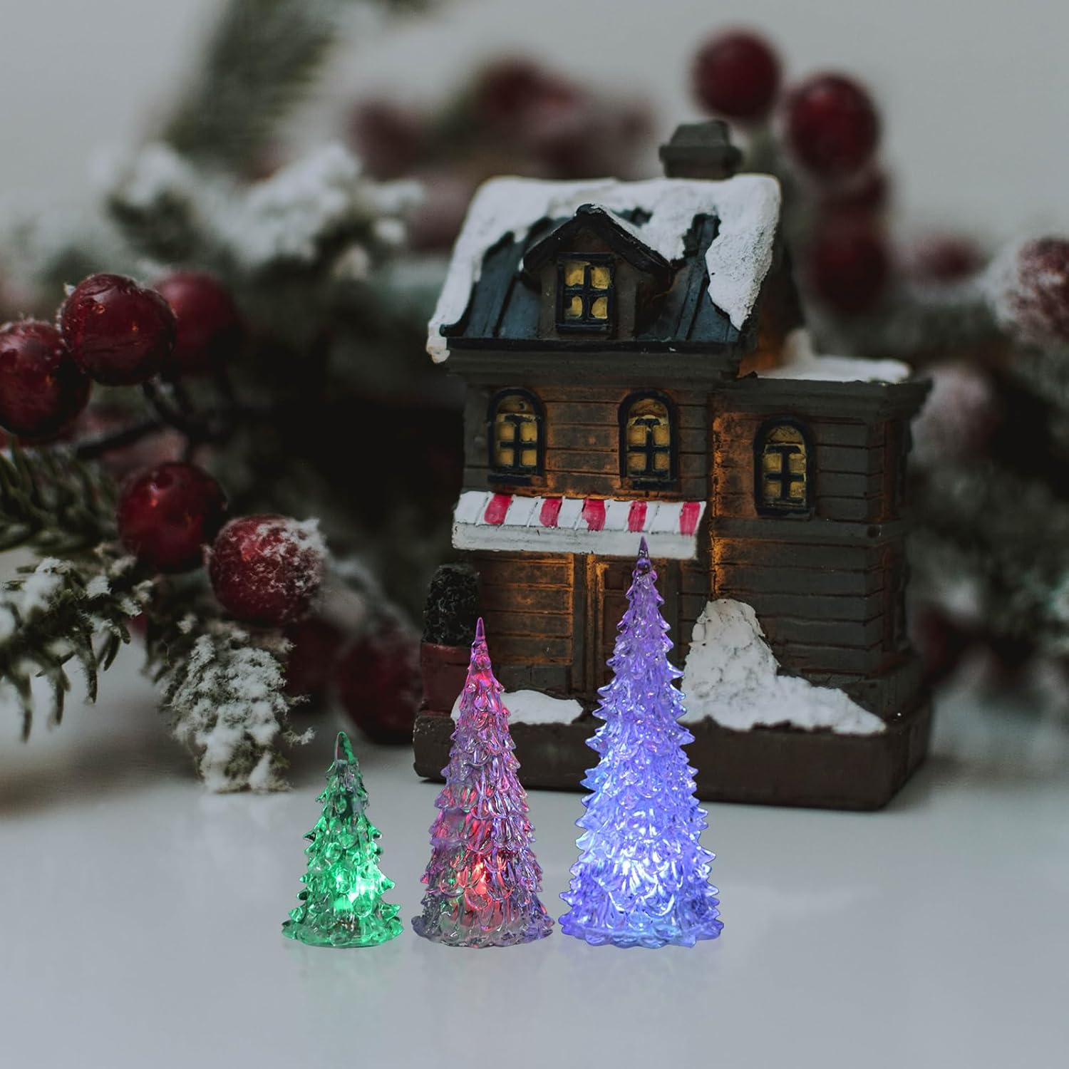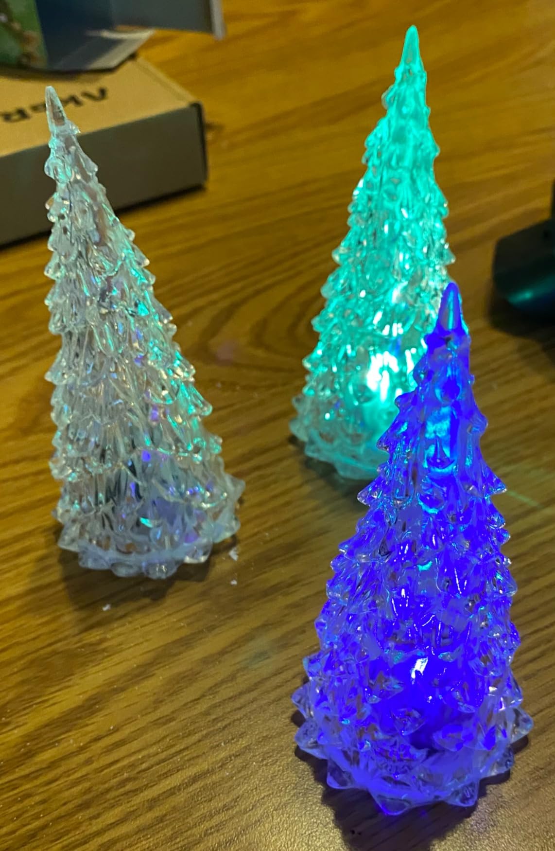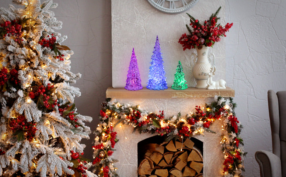 The set includes three beautifully designed acrylic Christmas tree figurines, each featuring integrated LED lights that create a delightful ambiance. Each tree is uniquely shaped and adorned with intricate details, ensuring they stand out as eye-catching table decorations. They are designed to transition between a spectrum of colors, adding a festive glow to your home decor. Ideal for use as centerpieces on dining tables, in windowsills, or on mantles, they help elevate the holiday spirit in any room.