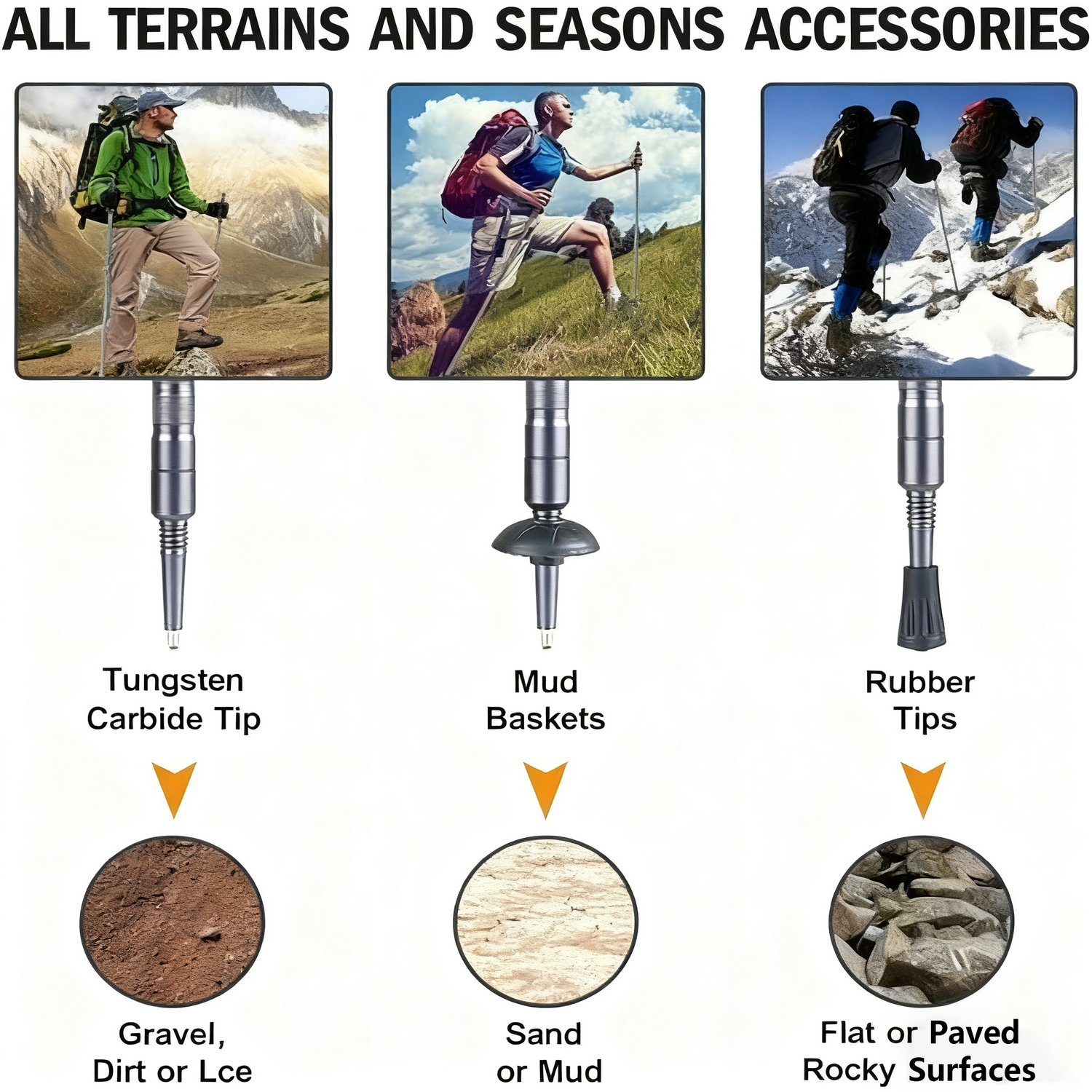 Equipped with 3 interchangeable tips, this trekking stick adapts to rocky paths, muddy trails, and snowy slopes with ease. One pole, endless landscapes — built for every adventure.