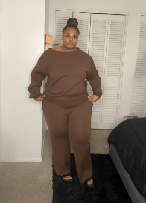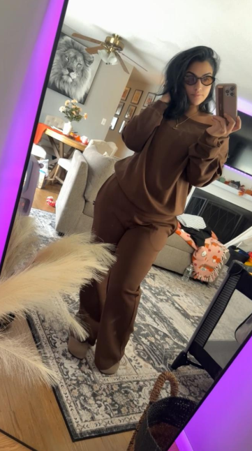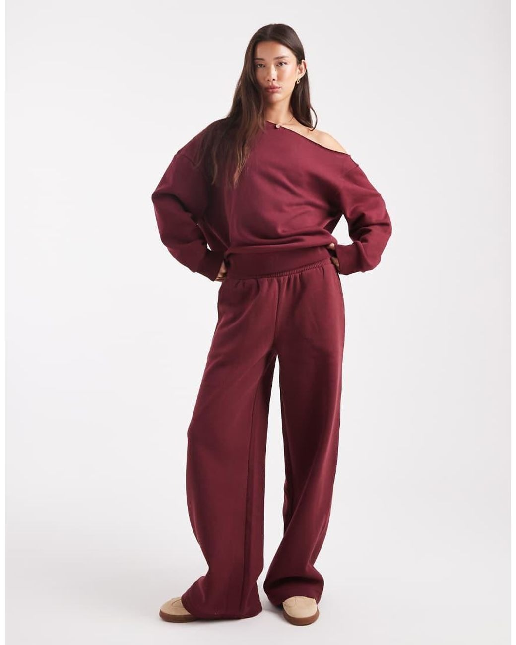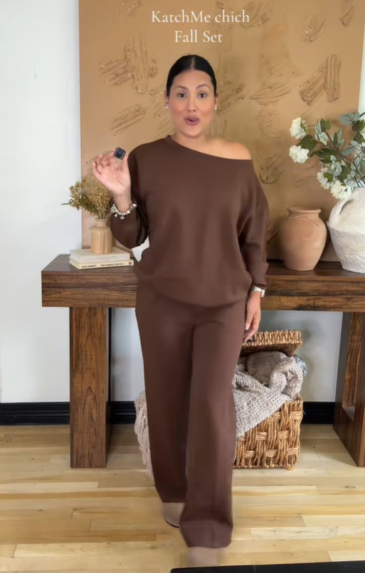 This two-piece set redefines off-duty chic — featuring a sloping shoulder top and wide-leg trousers that move with you. From cozy mornings to coffee dates, this outfit balances laid-back ease with modern style.