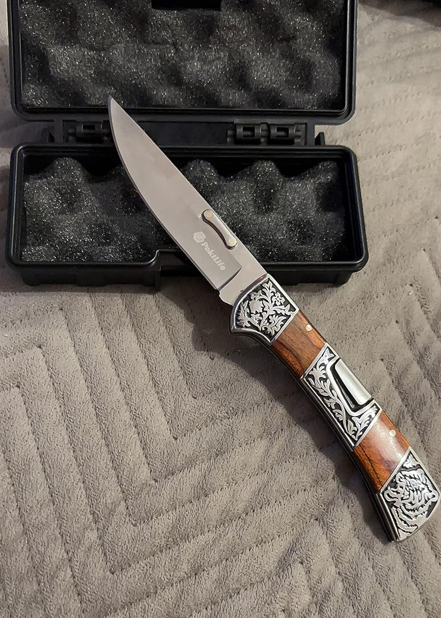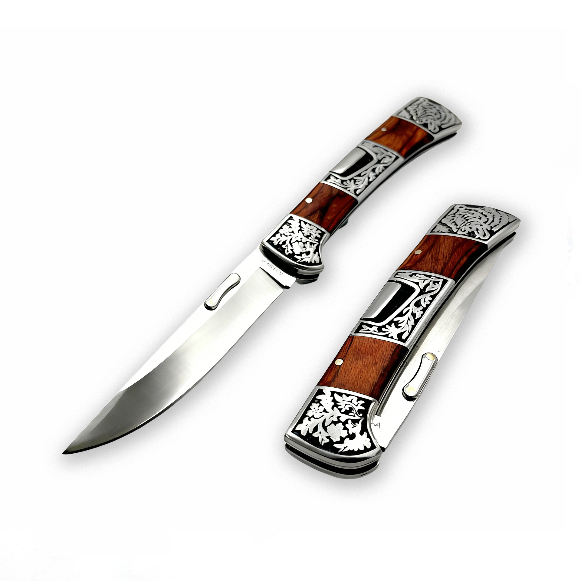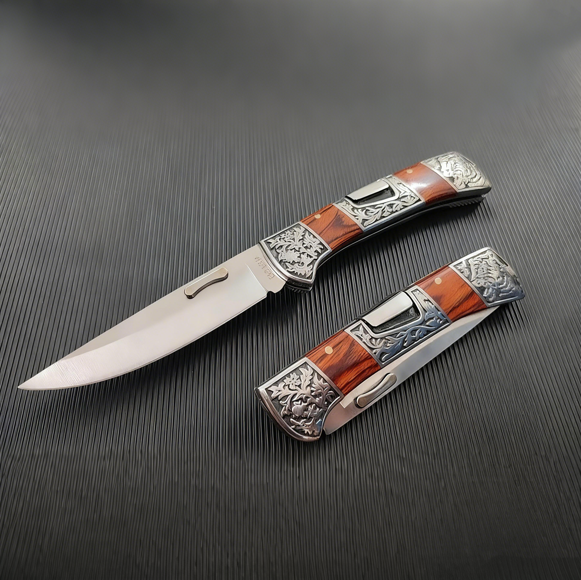 The Columbia 3159 features a stunning design with a combination of wooden handles and engraved metal accents. The handle showcases intricate floral patterns, adding a touch of elegance to the knife’s sleek, polished appearance. The stainless steel blade complements the handle's detailed design, creating a refined, balanced look.