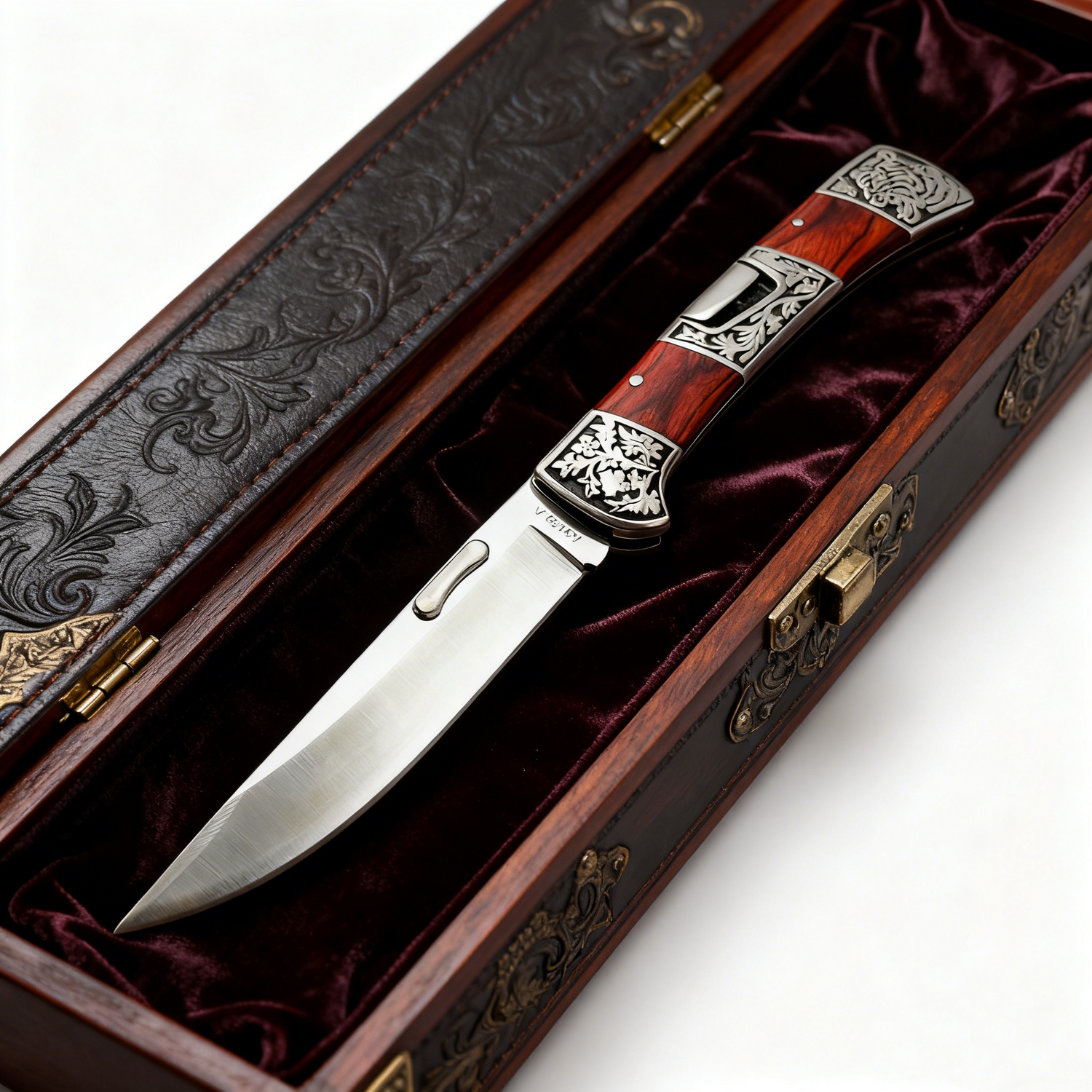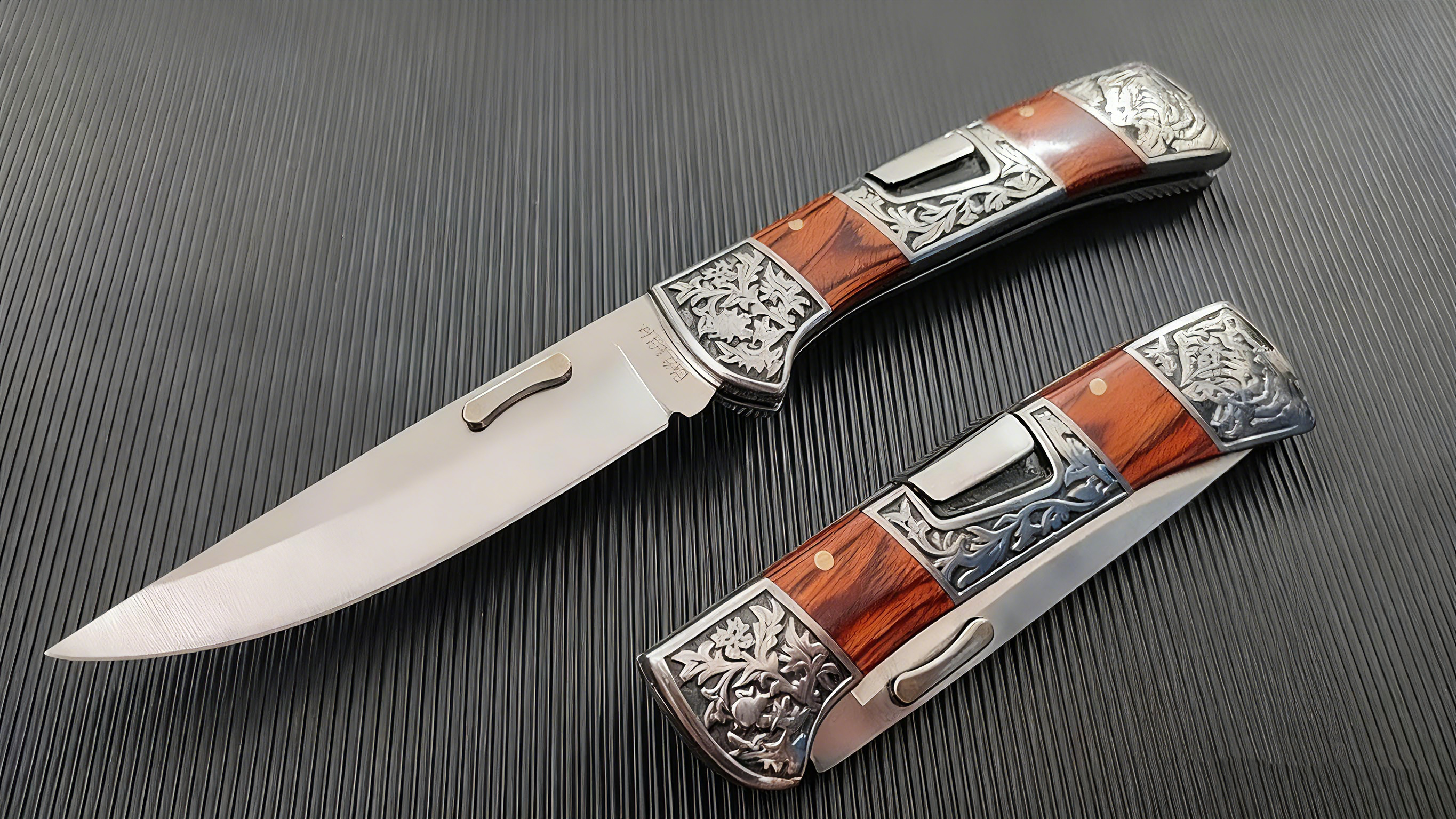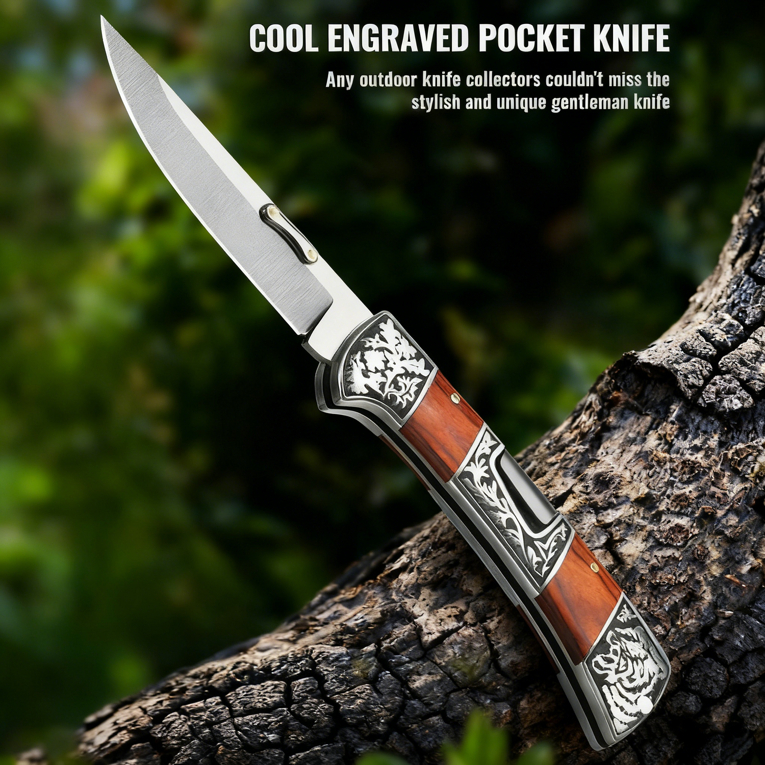 The Columbia 3159 features a stunning design with a combination of wooden handles and engraved metal accents. The handle showcases intricate floral patterns, adding a touch of elegance to the knife’s sleek, polished appearance. The stainless steel blade complements the handle's detailed design, creating a refined, balanced look.