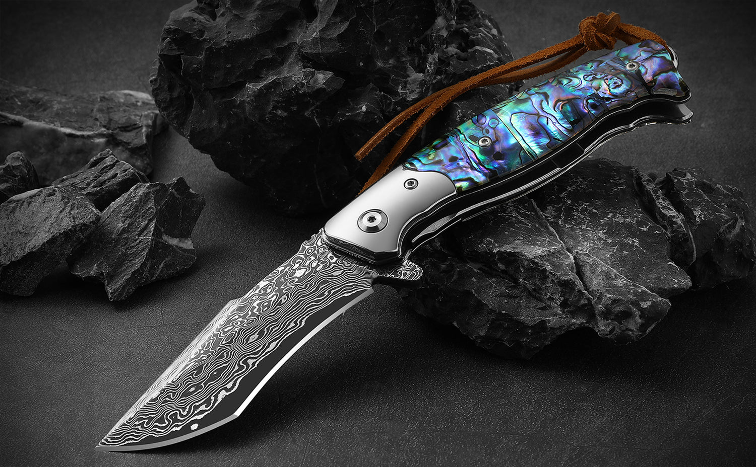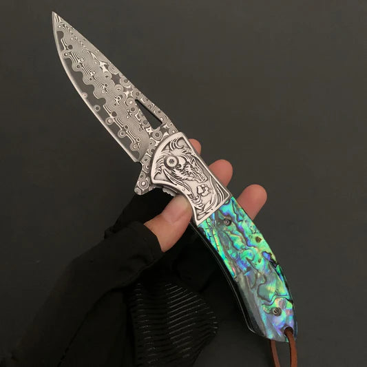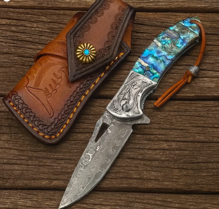 The blade is forged with multiple layers of steel, creating the iconic Damascus pattern that is both visually stunning and structurally resilient. Paired with a hand-polished, iridescent abalone handle, each curve and contour is carefully shaped for both comfort and elegance. From the seamless pivot to the perfectly balanced weight, this knife reflects meticulous attention to detai.