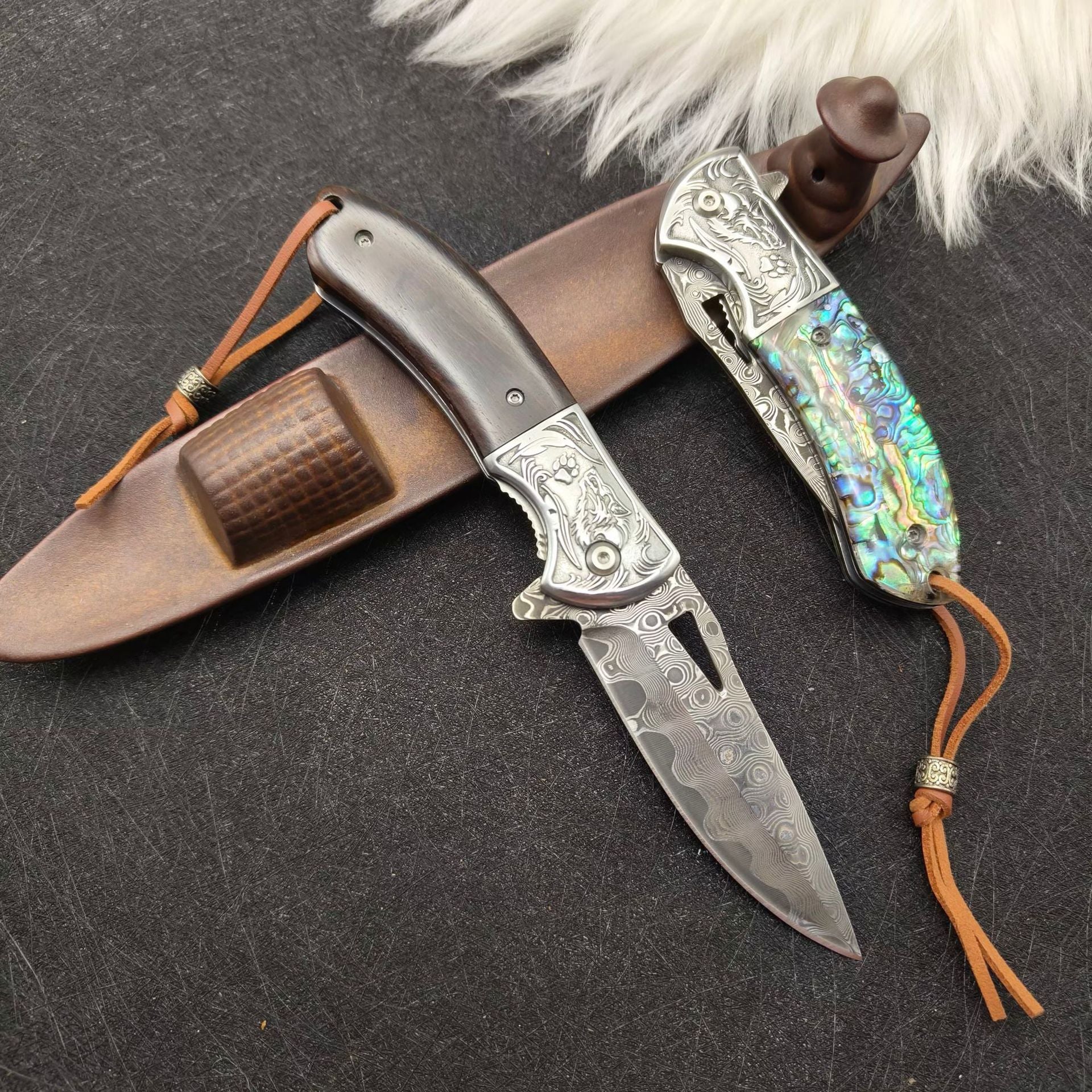 Damascus Steel EDC Folding Knife with Iridescent Abalone Shell Resin Handle