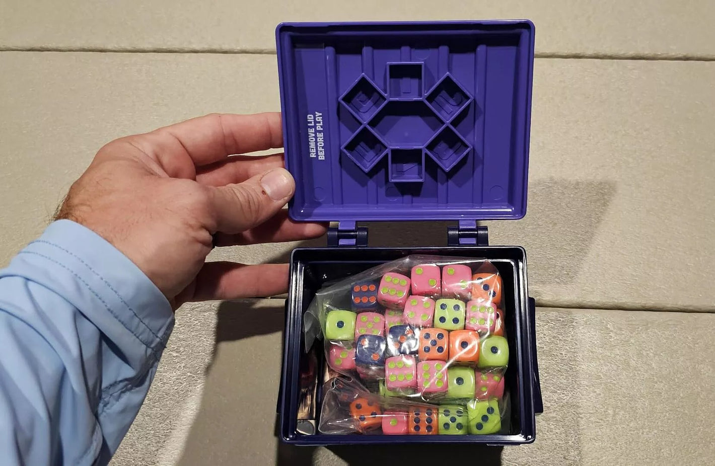 - The first player rolls one die. This die will be set in the line in its right spot on the lid. The goal of this is to make a straight from 1 to 6.