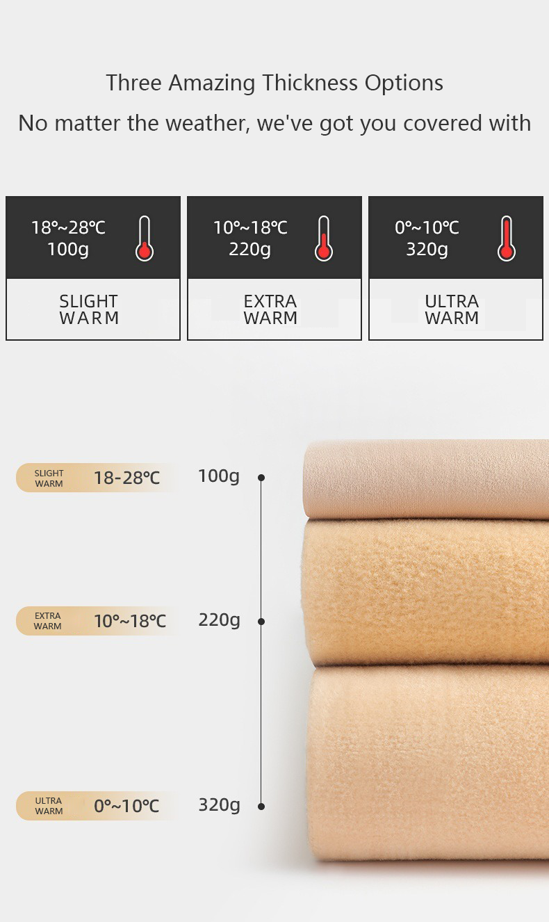 No matter the season, we’ve got the perfect fit for you! Choose from three luxurious thicknesses for ultimate warmth and comfort. Even in the coldest winters, our thickest option keeps you cozy without feeling bulky. Say goodbye to seasonal limits!