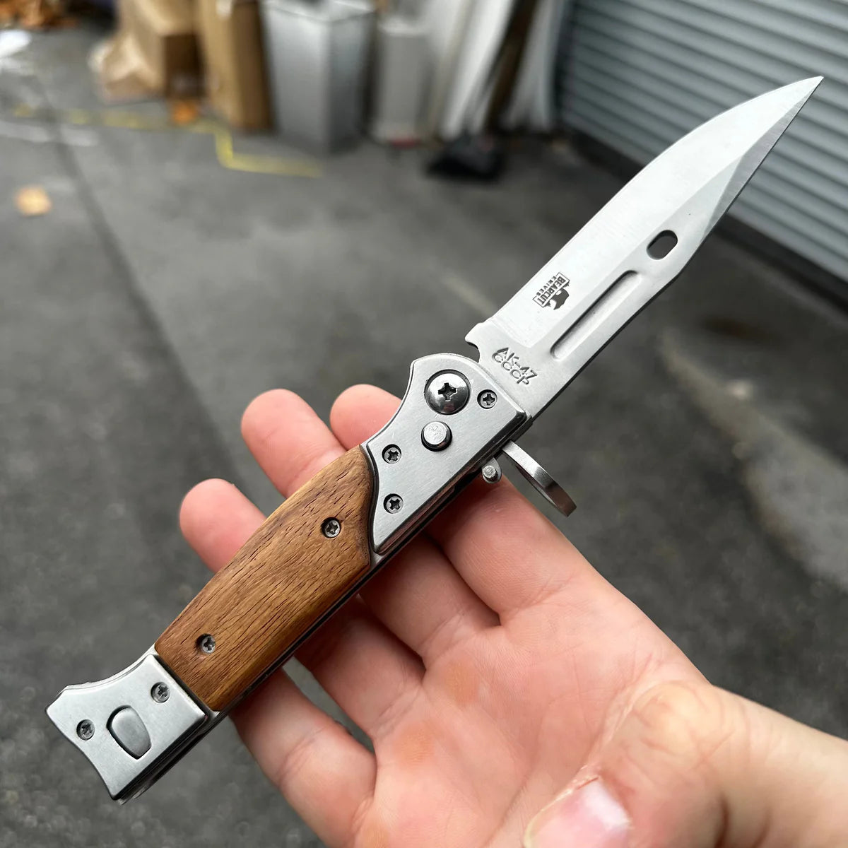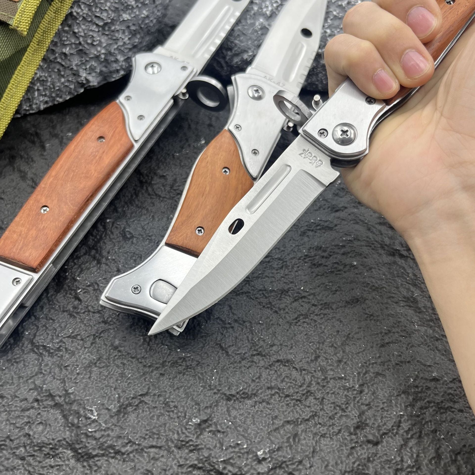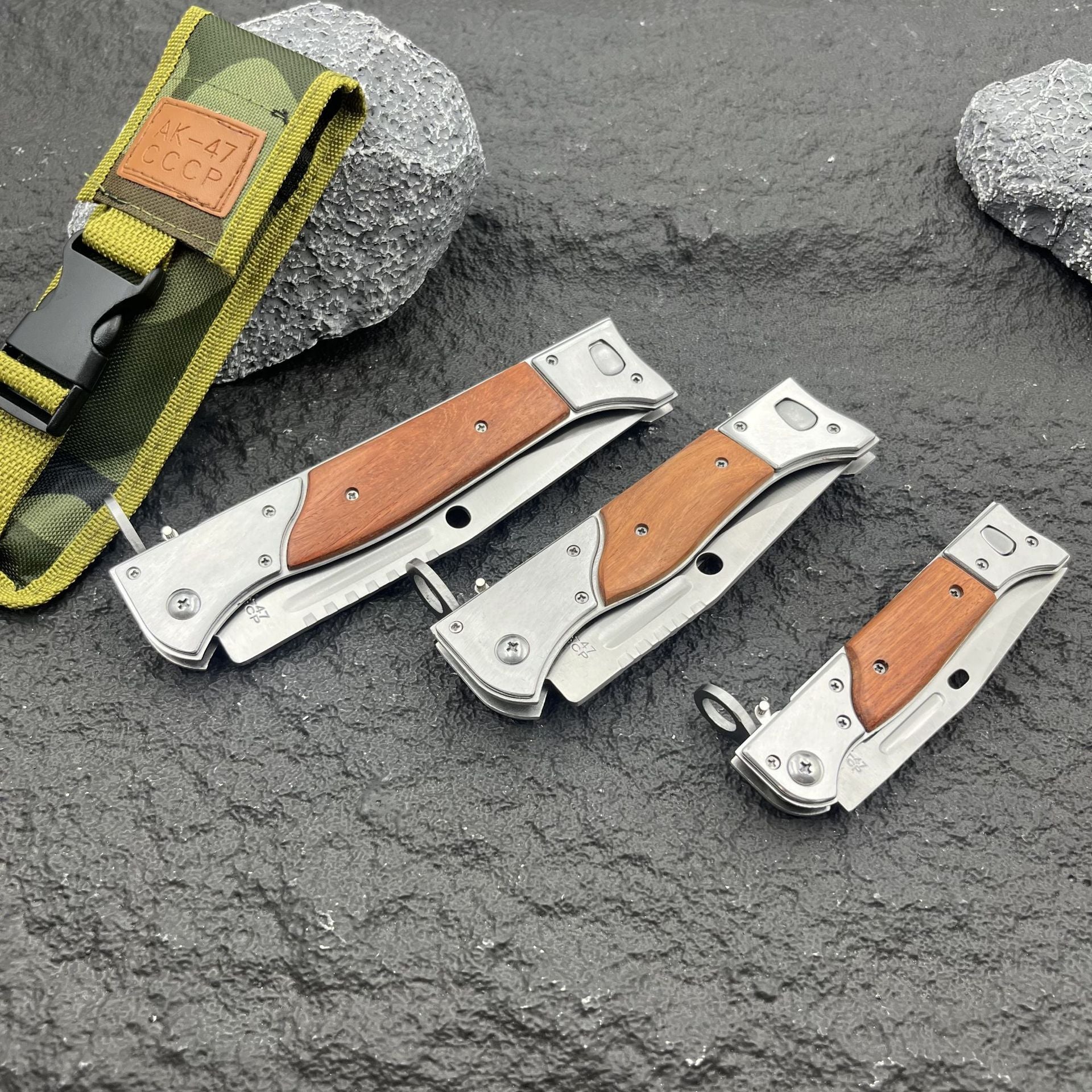 Precision-engineered with a 13" 440C steel blade and authentic wooden handle, this tactical folding knife combines iconic AK-47 heritage with robust button-lock technology. The innovative slide safety lock ensures instant deployment and secure handling, making it your ultimate EDC tool for camping, hunting, and survival.