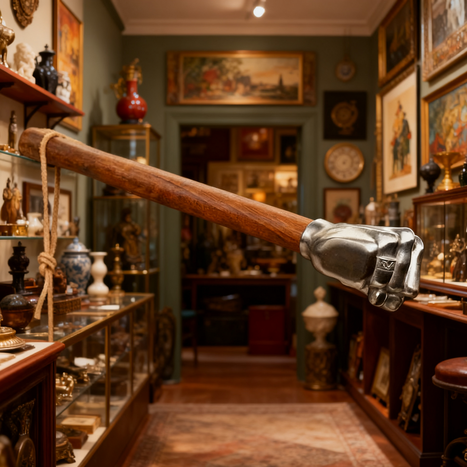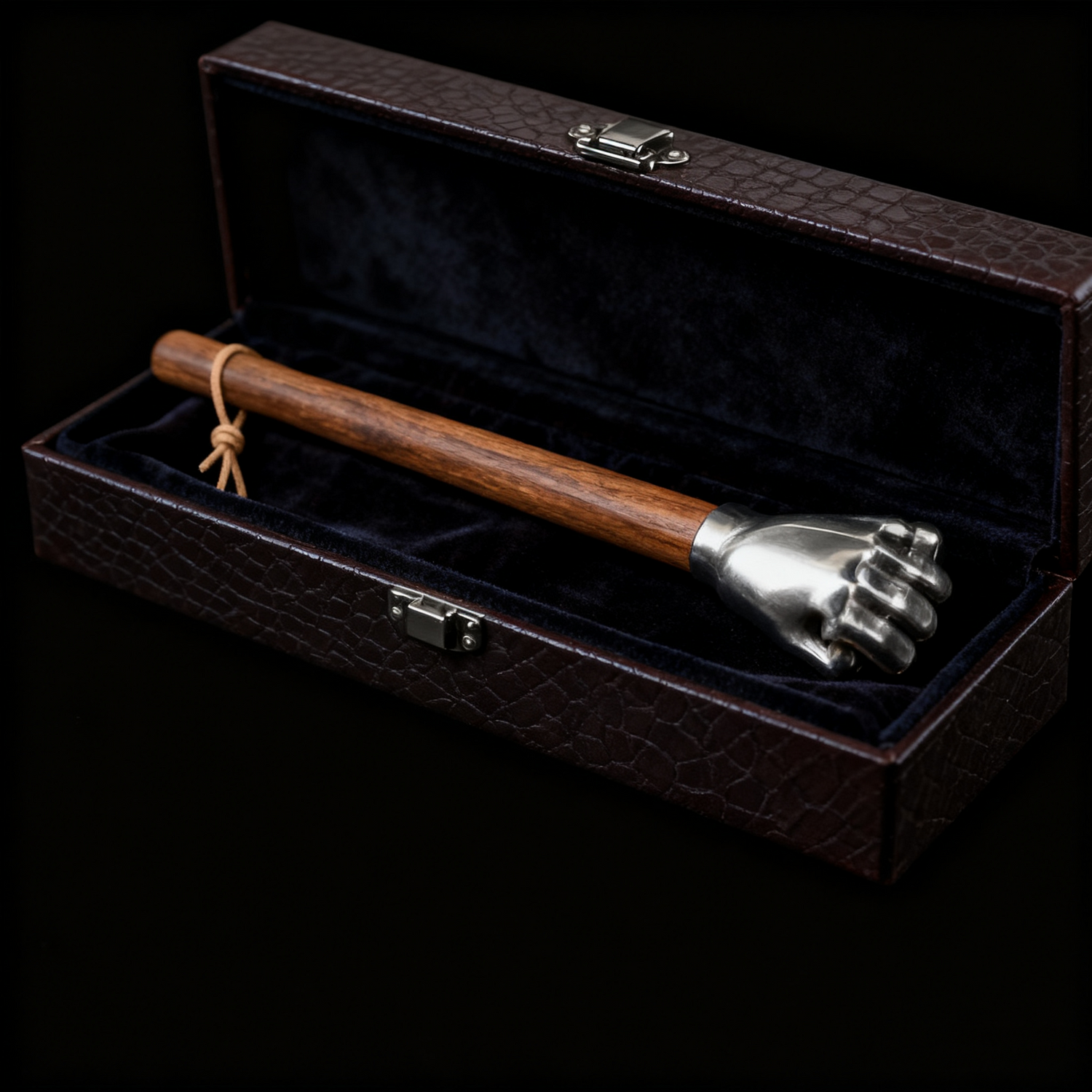 This hammer doubles as a striking decor element. Its hand-forged fist-shaped head with 20% silver content and smooth wooden handle create a bold visual statement, perfect for shelves, desks, or display cases.