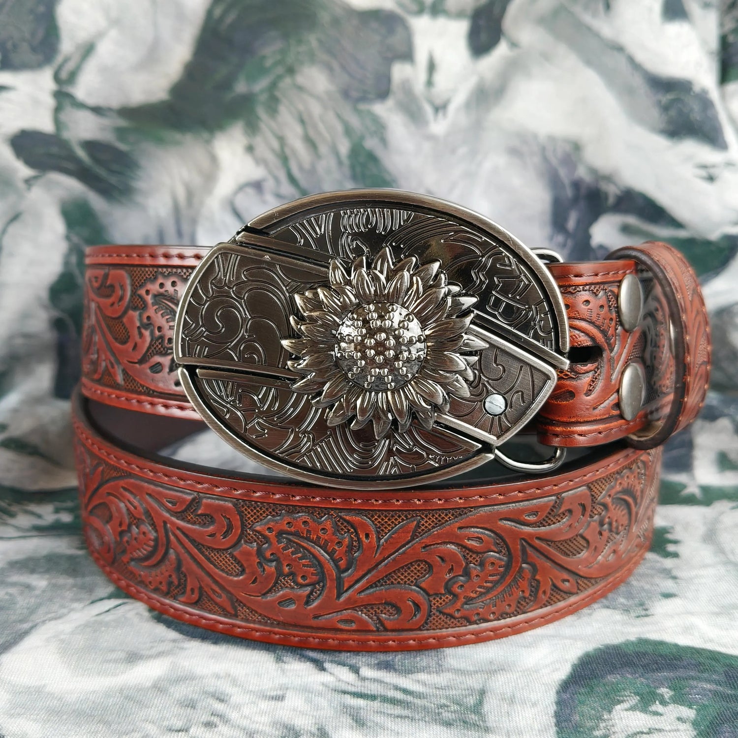 Hidden Utility Belt Buckle - Embossed Leather Western Cowboy Belt