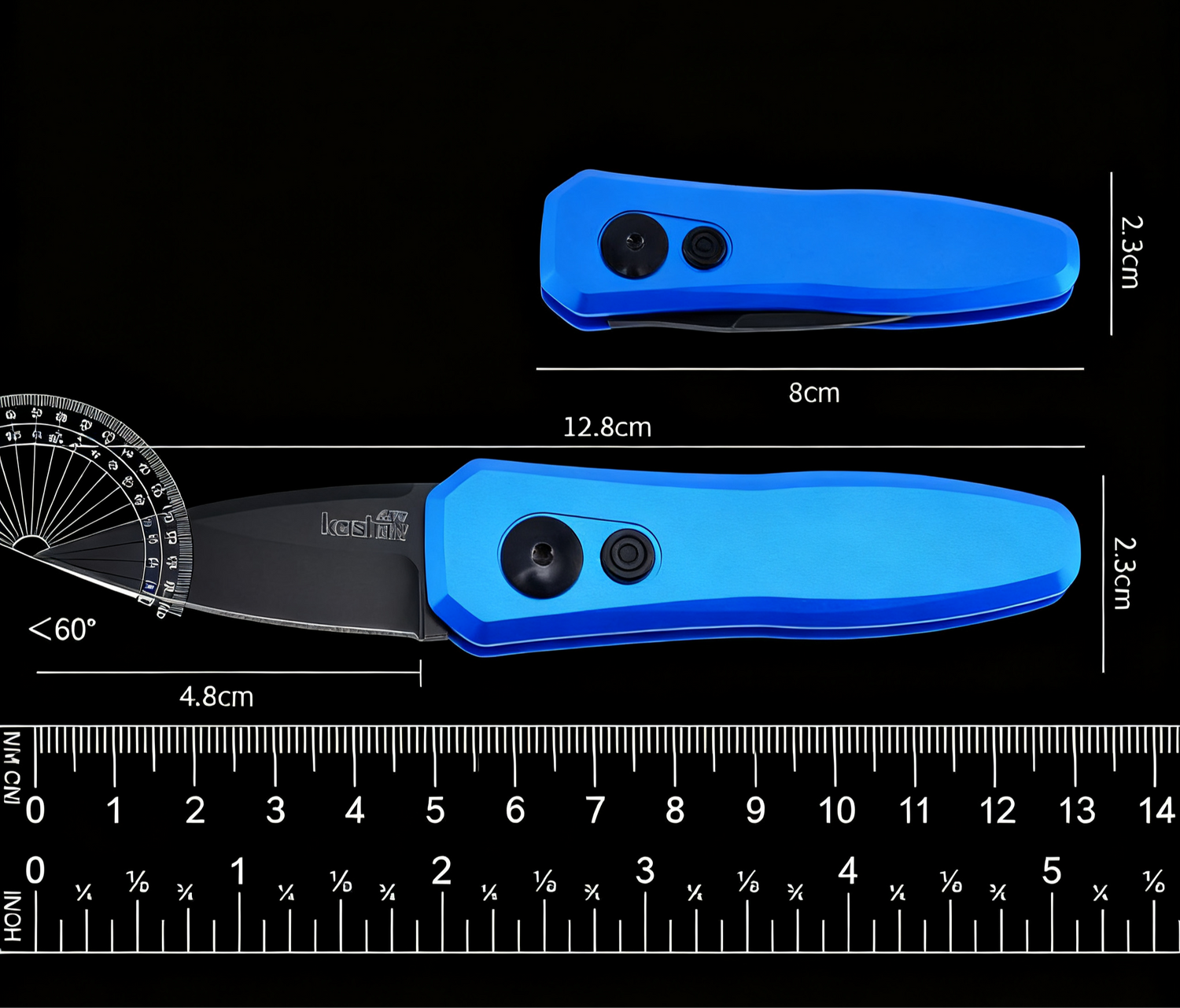 - Handle: Blue anodized aluminum (contoured, smooth, fade-resistant) with aligned recessed push-button (anti-accidental deployment).