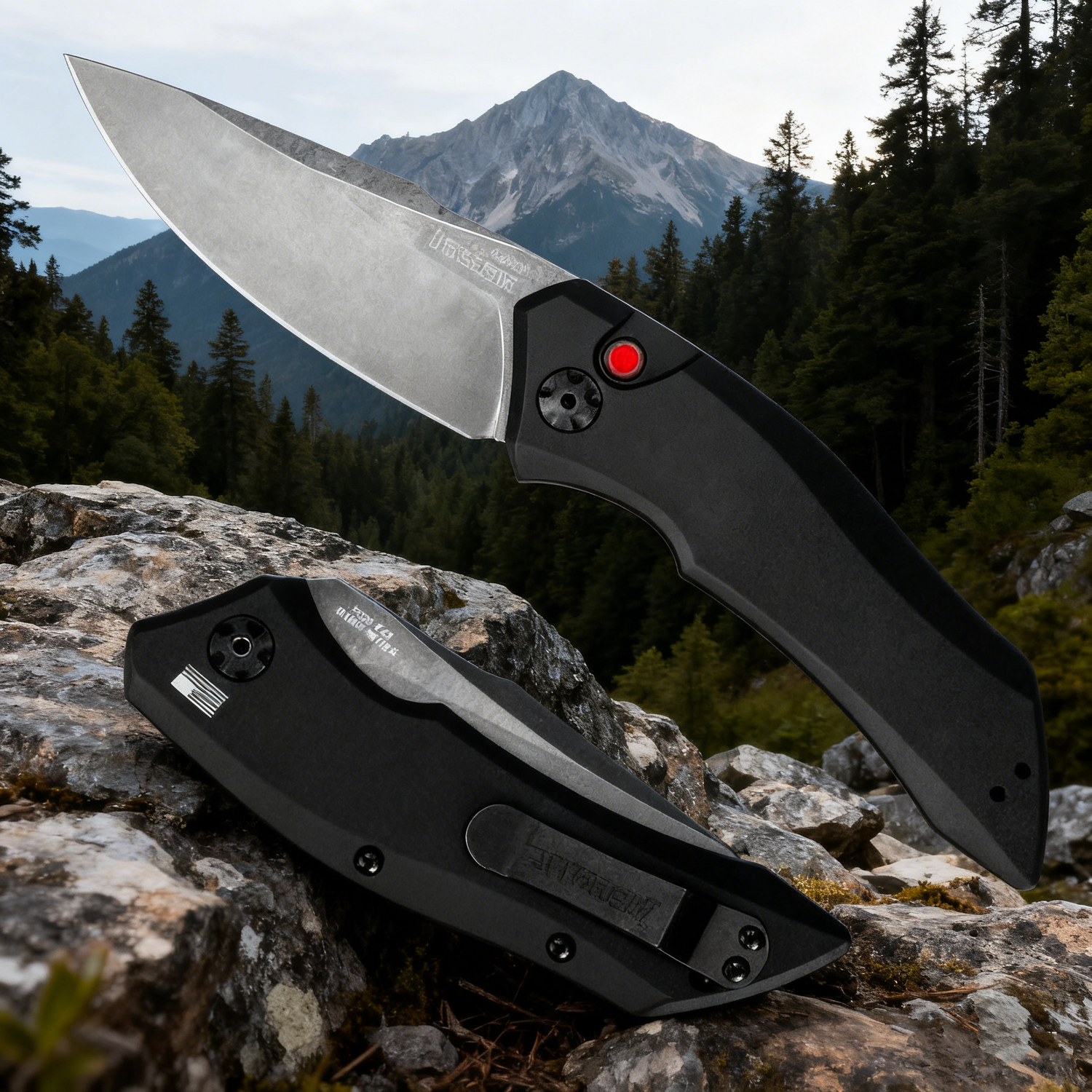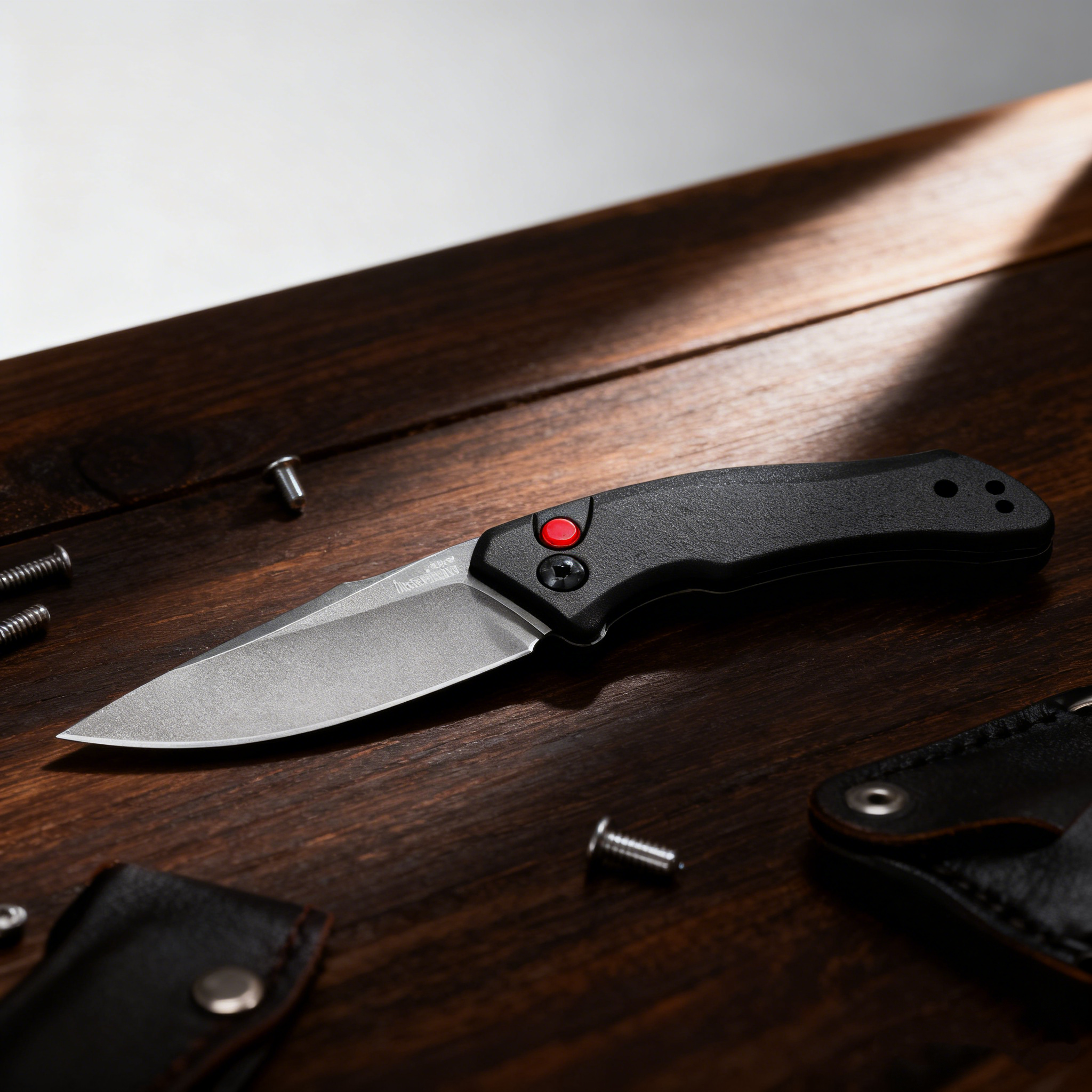 The Kershaw Launch 1 boasts a sleek, modern design with a distinctive BlackWash™ finish. The ergonomic aluminum handle enhances its clean, minimalist aesthetic, while the streamlined blade and low-profile push button contribute to its sophisticated look.