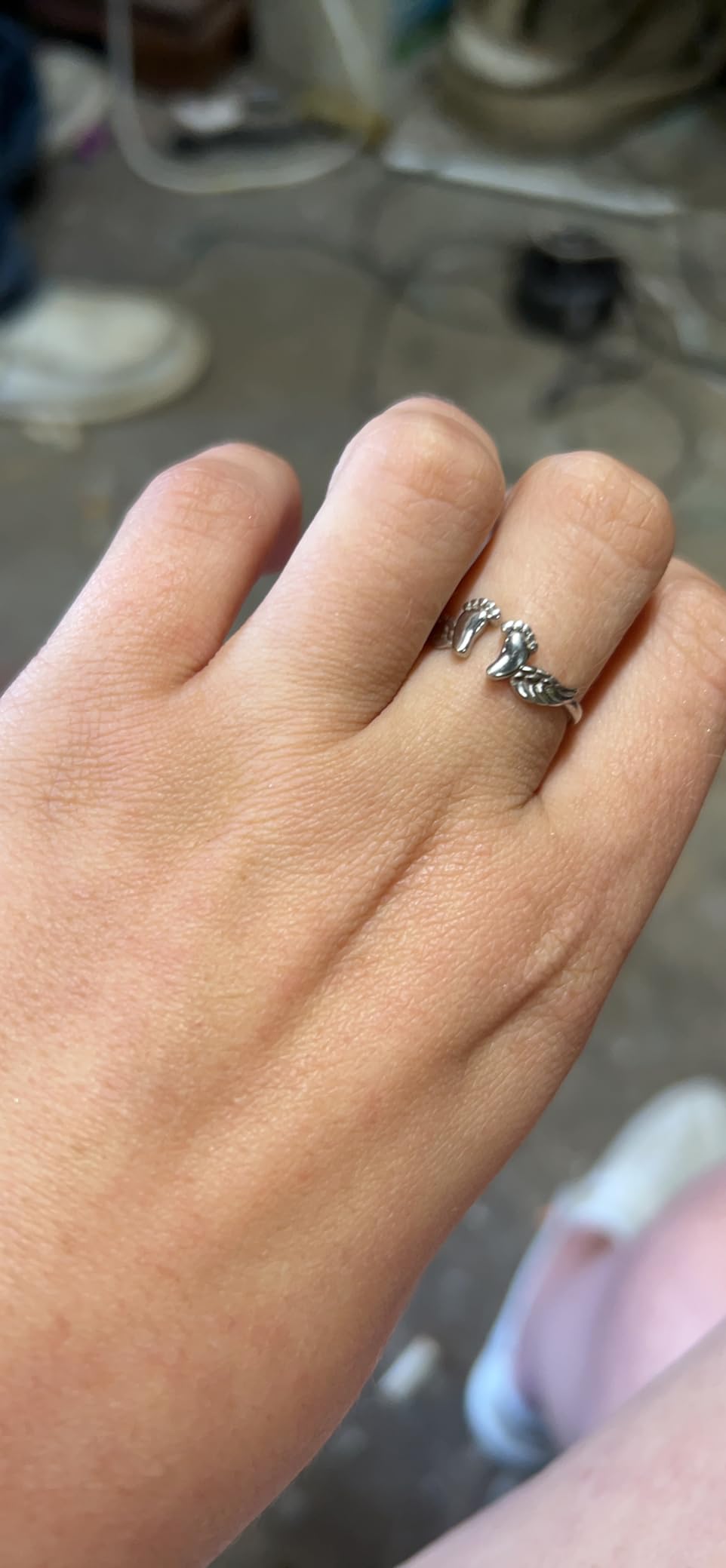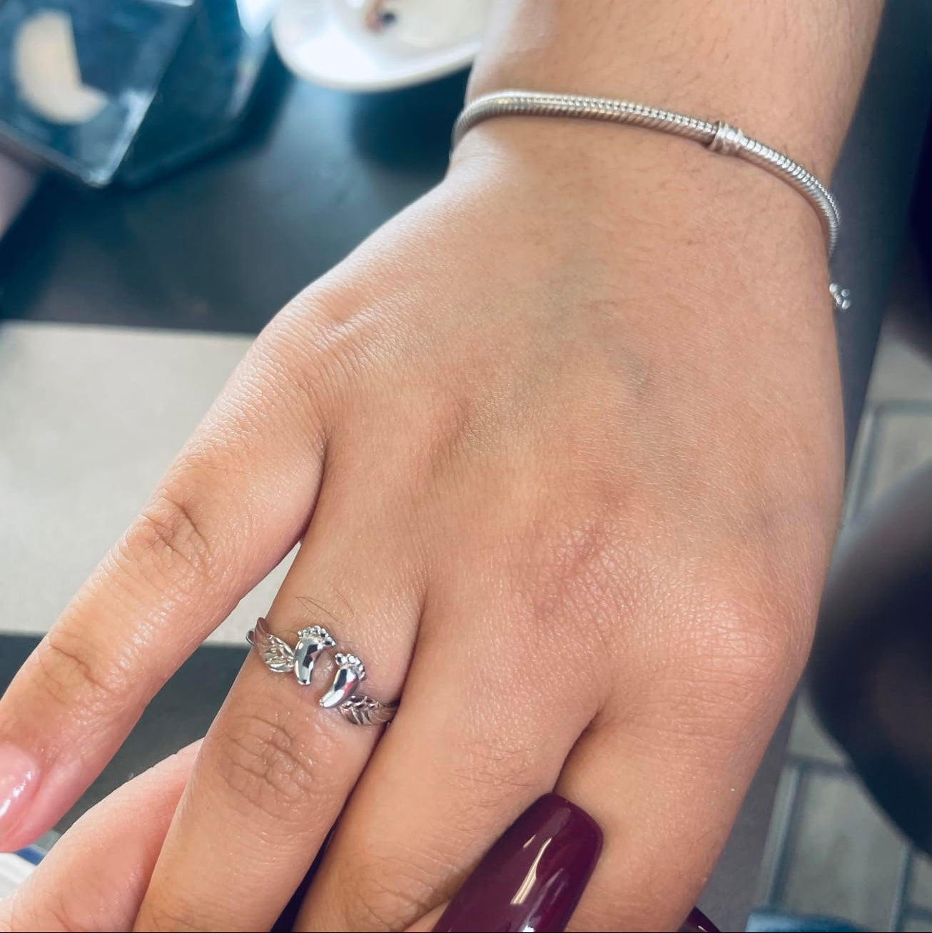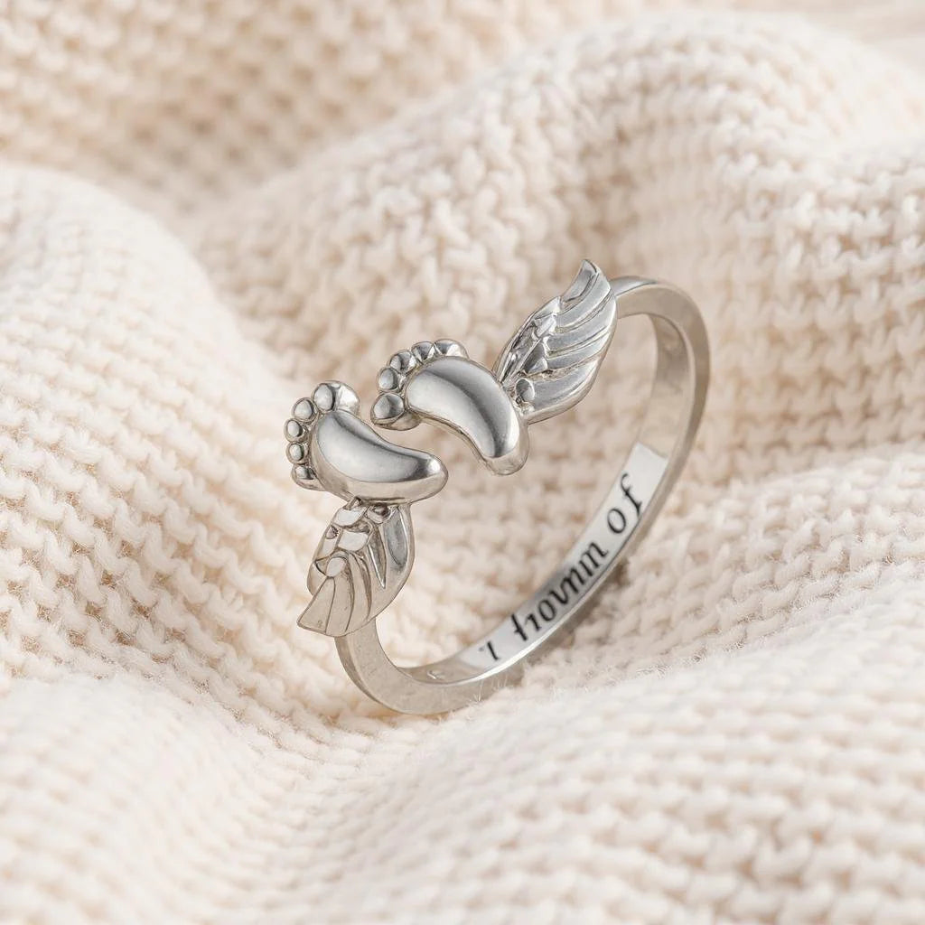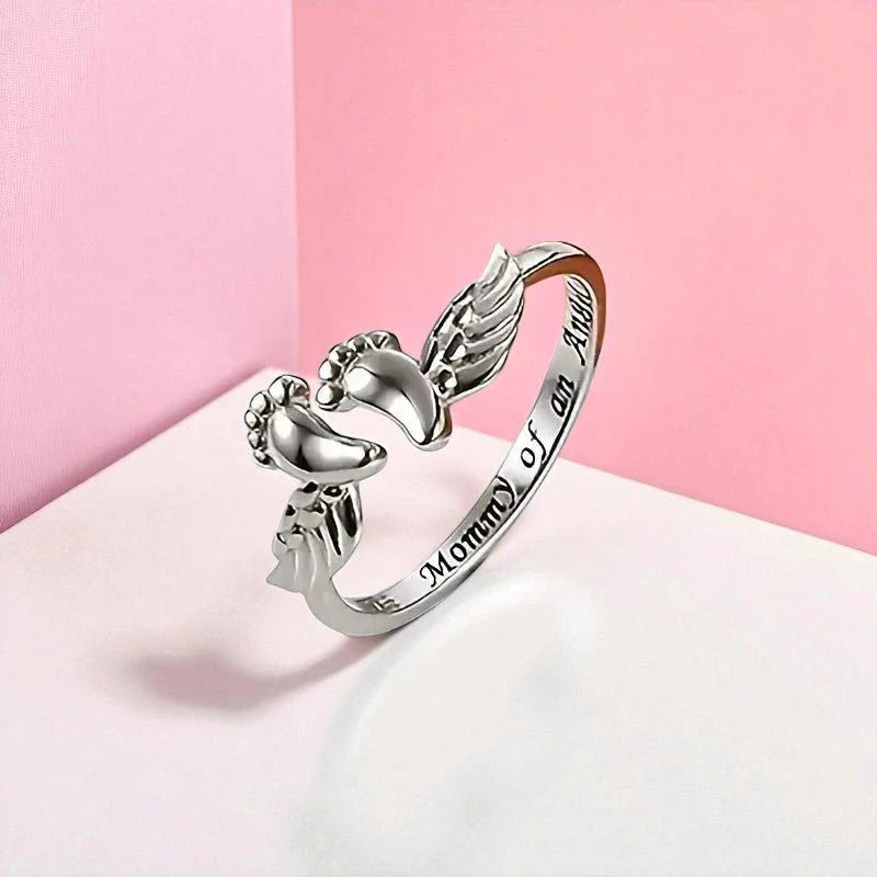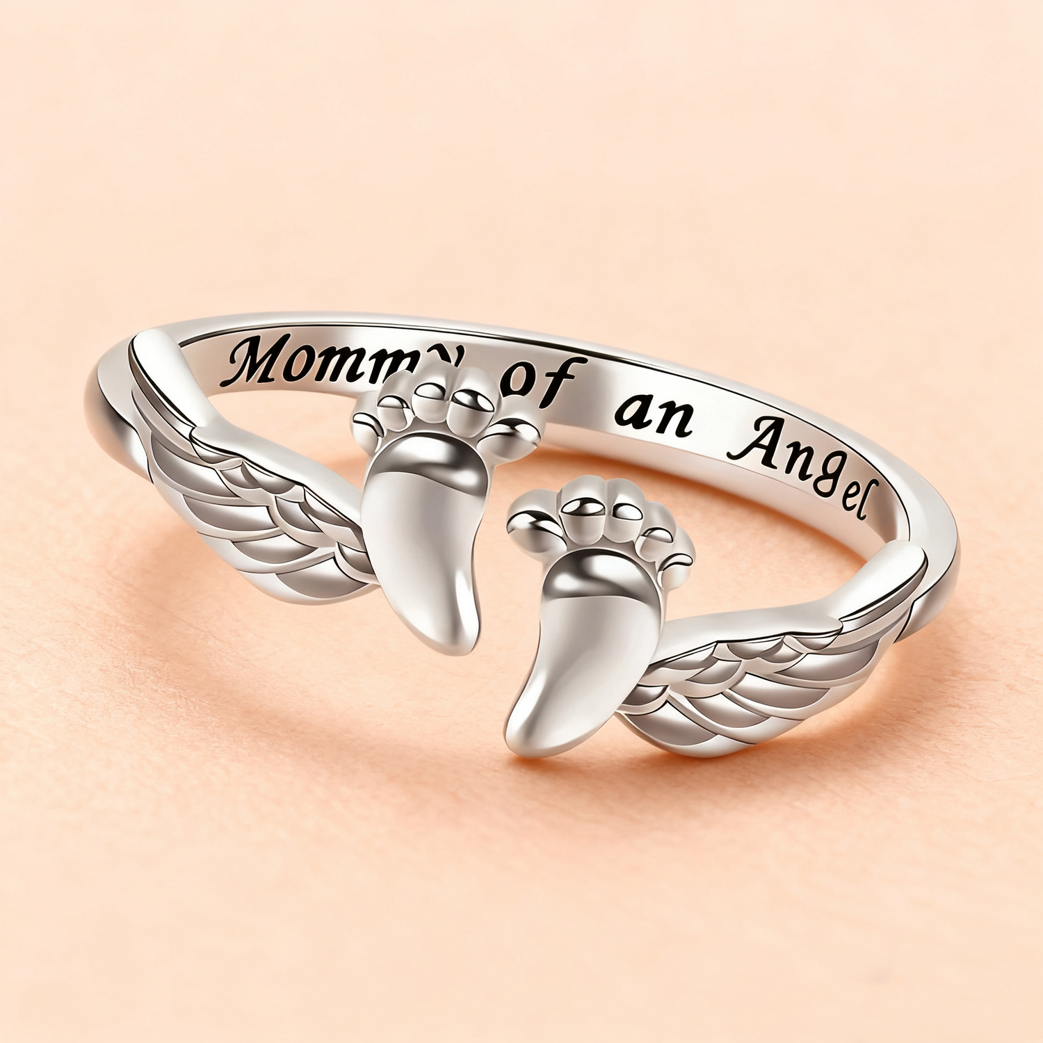 Two tiny baby footprints rest gently within soft angel wings, symbolizing the little life once carried in your heart—now a guardian watching over you with grace. The polished sterling silver band features the engraved words “Mommy of an Angel,” a quiet yet powerful reminder of a love that lives on beyond this world.