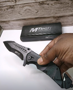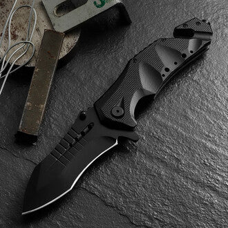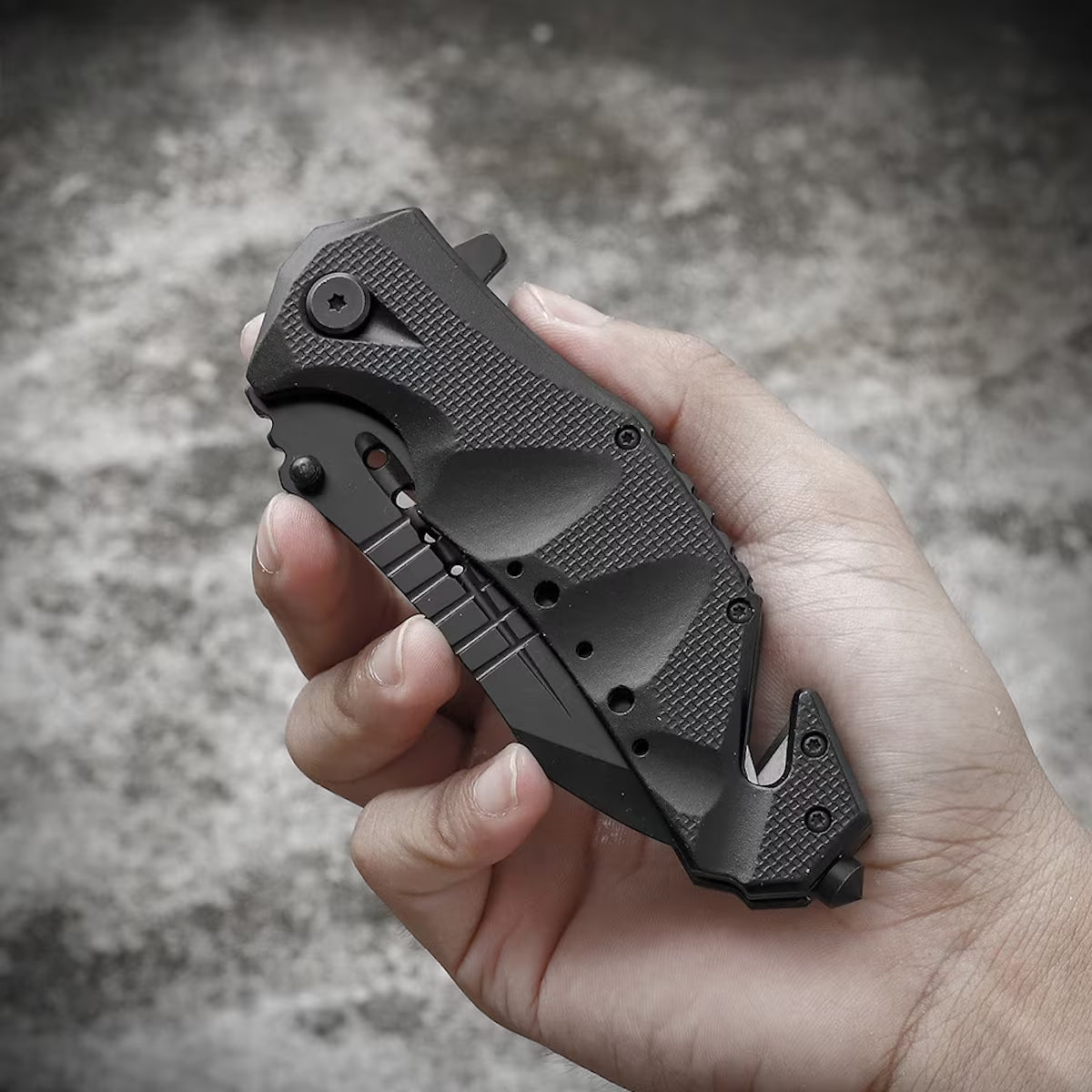 Every line, curve, and angle is designed with precision. The sleek black-coated blade catches the light, reflecting its tactical elegance. The textured handle fits naturally in your hand, while the folding mechanism blends seamlessly into the silhouette. Every detail exudes strength, sophistication, and craftsmanship.