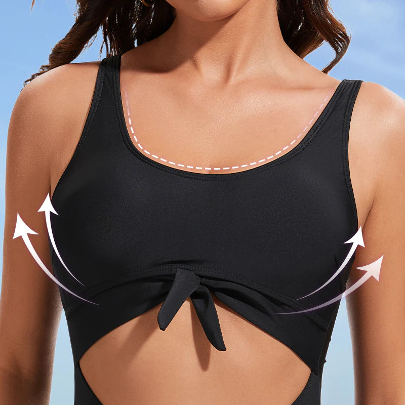 Step into the spotlight with this ultra-flattering one-piece swimsuit that sculpts, supports, and makes a statement.With its ruched tummy control, adjustable tie-knot front, and open back detail, it offers a confident blend of coverage and allure.Whether you're lounging poolside or chasing waves at the beach, this suit hugs you in all the right places while keeping comfort at its core.