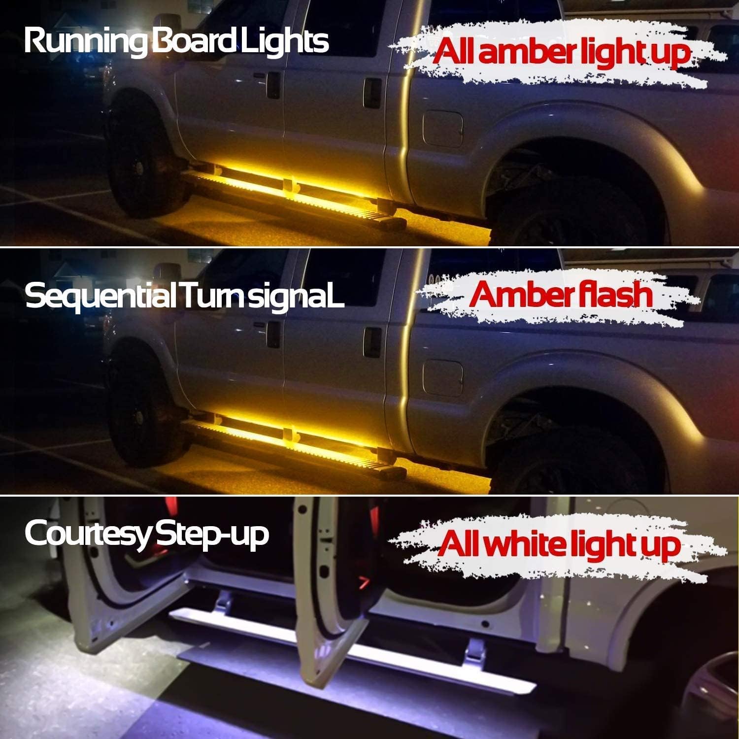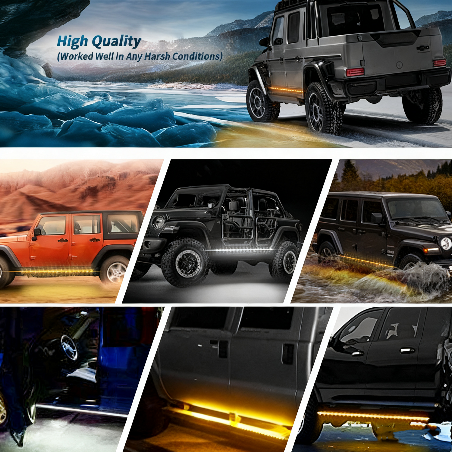 Enhance your ride with ultra-bright dual-color LED running board lights that blend performance and design. With smooth white-to-amber transitions, waterproof protection, and easy installation, your vehicle stands out day and night