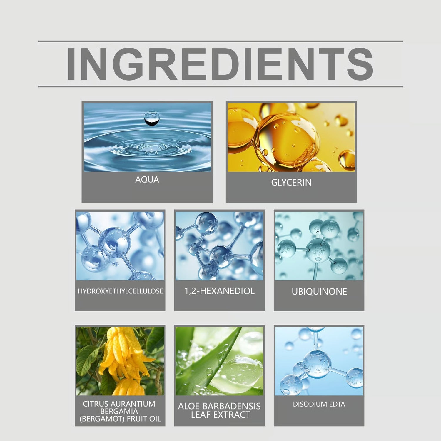Every drop is powered by a blend of hydrating, firming, and soothing ingredientsâfrom skin-loving Glycerin to antioxidant-rich Ubiquinone and calming Aloe Vera. Visible results, backed by science.