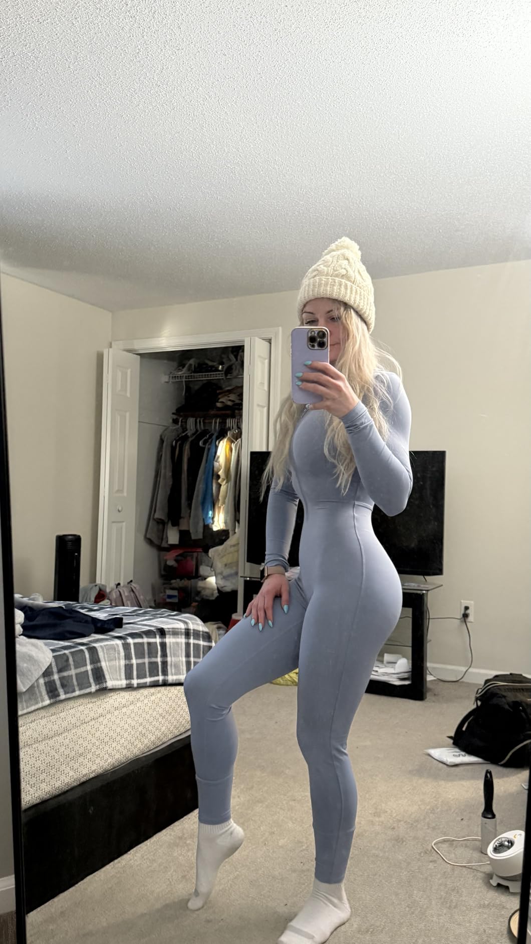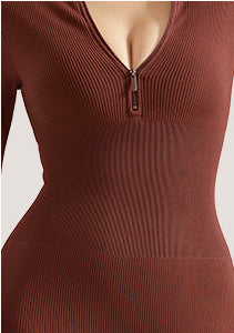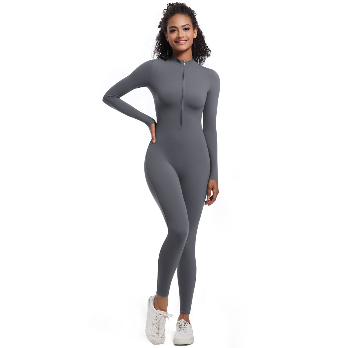 This long-sleeve jumpsuit features a body-hugging fit that highlights your natural curves while providing a modern, elegant look. The sleek black color and front zipper detail add a touch of sophistication, making it perfect for both workouts and casual outings.